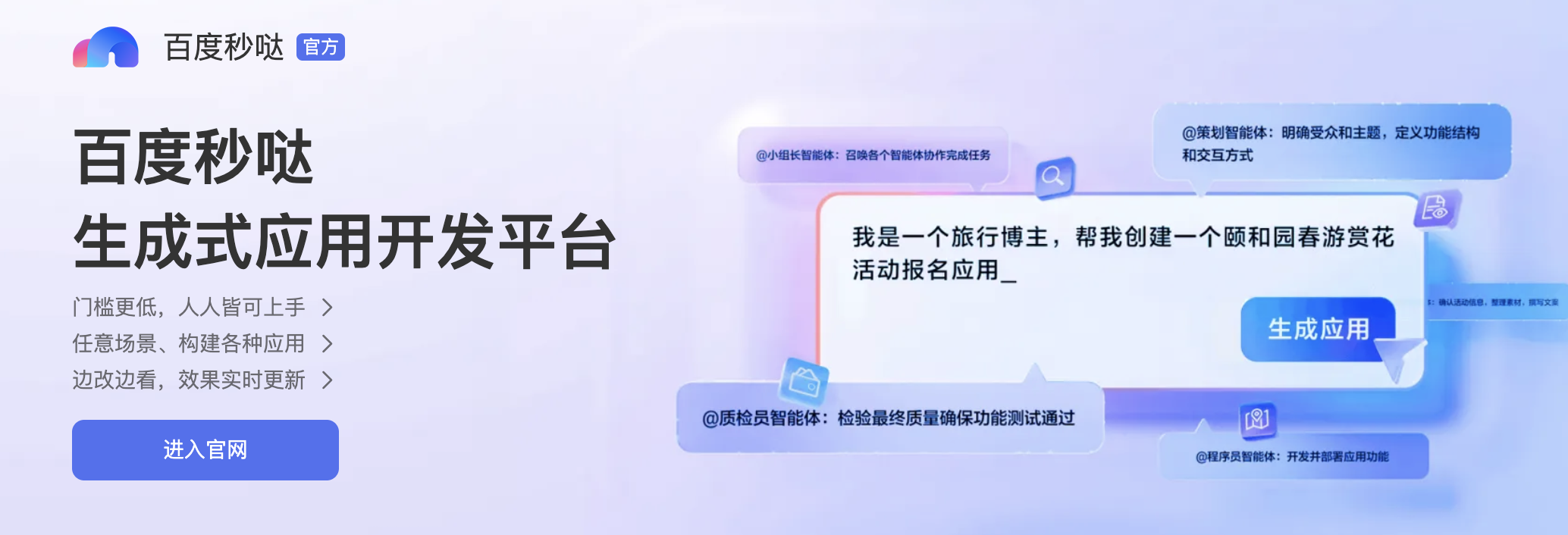 在去年11月的百度世界大會上,秒噠曾首次發(fā)布亮相,百度提出“多智能體協(xié)同”概念,發(fā)布即吸引超20000家企業(yè)申請內(nèi)測。這也是該產(chǎn)品的正式落地,用戶可以前往首頁體驗(yàn)H5和網(wǎng)站開發(fā)。