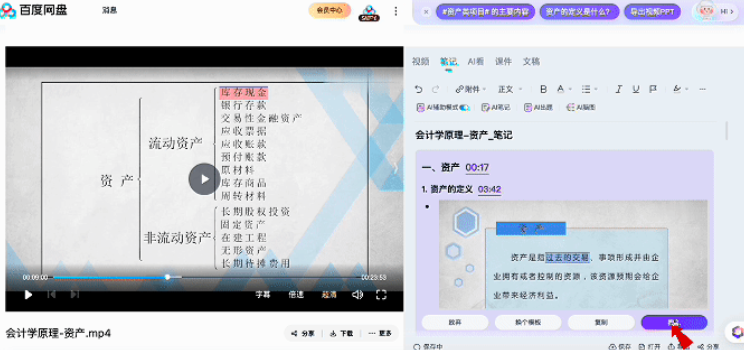 結(jié)合AI筆記,百度網(wǎng)盤還推出了諸多學(xué)習(xí)工具。在百度網(wǎng)盤和文庫全面融合的基礎(chǔ)上,AI筆記可直接導(dǎo)出PDF、網(wǎng)盤一鍵打印,以帶視頻的鏈接形式分享到微信,或直接發(fā)布到文庫。
