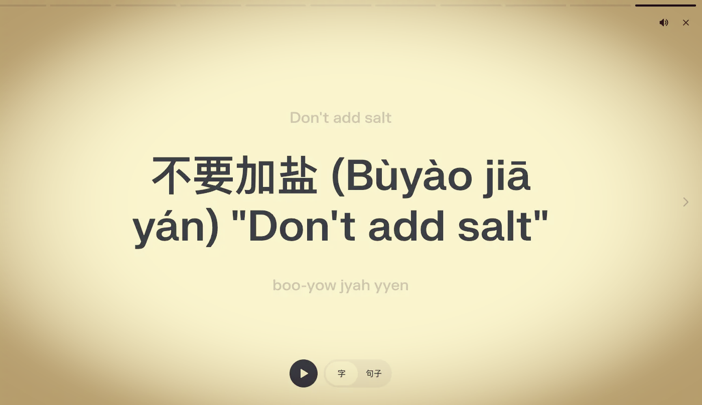 當筆者輸入“learn Chinese about food”時,Perplexity很快給出了一些答案。當點擊“炸”后,Perplexity會閃現(xiàn)出一張張關于食物的中文單詞和句子表達,并提供讀音和釋義。