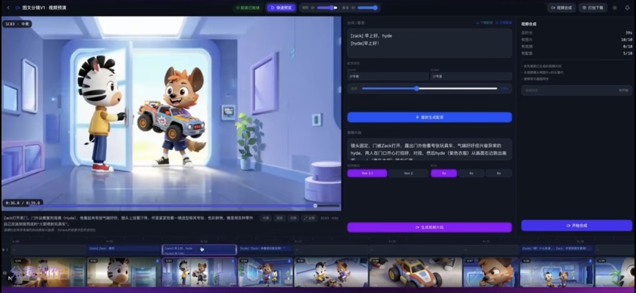 斑馬視頻內(nèi)容組的一個(gè)同事做了一套基于 AI 的視頻生成系統(tǒng),從最初的創(chuàng)意腳本,到分鏡設(shè)計(jì),再到最終視頻生成,全流程都在里面了。