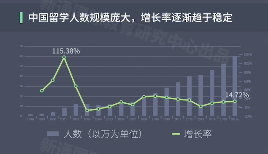 中國(guó)留學(xué)生人數(shù)規(guī)模龐大,2016年留學(xué)人數(shù)約為60萬(wàn)。增長(zhǎng)率逐漸趨于穩(wěn)定,2016年增長(zhǎng)率為14.75%。
