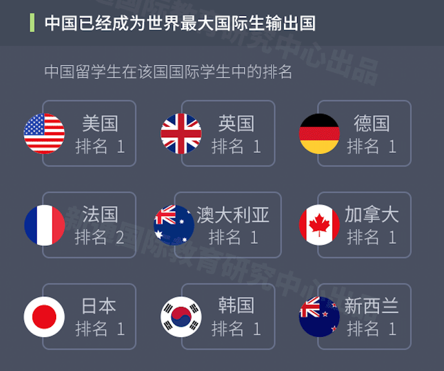 中國(guó)已經(jīng)成為世界上最大輸出國(guó)。中國(guó)留學(xué)生人數(shù)在以下國(guó)家的留學(xué)生人數(shù)中排名第一:美國(guó)、英國(guó)、德國(guó)、澳大利亞、加拿大、日本、韓國(guó)、新西蘭;在法國(guó)排名第二。