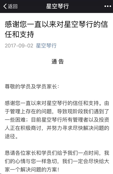 昨日星空琴行微信公眾號發(fā)布《感謝您一直以來對星空琴行的信任和支持》一文,內(nèi)文表示“懇請各位家長和學(xué)員們給予我們一點(diǎn)時(shí)間”,“我們一定會盡快給大家一個解決問題的方案”。