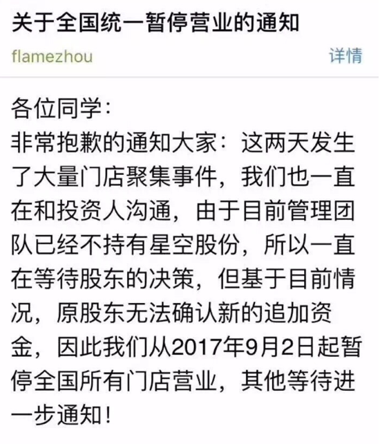但群情難控,發(fā)展至繼續(xù)向其他門店出發(fā),依然存在激進(jìn)的言語。為避免暴力沖突,上海門店被通知當(dāng)晚提前閉店。由此出現(xiàn)家長瘋傳星空倒閉。