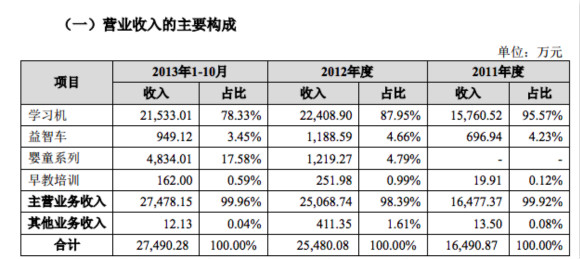 學(xué)習(xí)機(jī)是嘉達(dá)早教的主打產(chǎn)品。2014年在嘉達(dá)早教收入構(gòu)成中,學(xué)習(xí)機(jī)產(chǎn)品實(shí)現(xiàn)營(yíng)收金額為2.49億元,占據(jù)營(yíng)業(yè)收入的比例為79.23%。2011-2013年,學(xué)習(xí)機(jī)產(chǎn)品營(yíng)收金額分別為:2.60億元、2.24億元、1.58億元,占比分別為:86.89%、87.95%、95.57%。嘉達(dá)早教營(yíng)收對(duì)學(xué)習(xí)機(jī)的依賴,可見一斑。