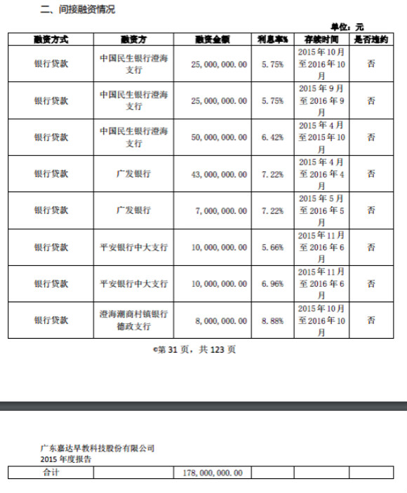 為了資本運(yùn)作,從2015年9月份到2015年11月份,短短3個(gè)月里,嘉達(dá)早教從銀行貸款7800萬元。而這一年,嘉達(dá)早教通過銀行融資,共計(jì)1.78億元。