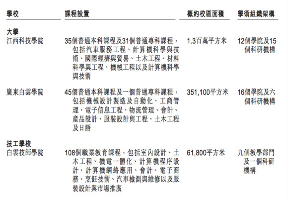 招股書顯示,江西科技學院2016年的初次 就業(yè)率約為88.1%,廣東白云學院2016年的初次就業(yè)率約為96.1%,而白云技師學院 2016年的初次就業(yè)率則約為99.4%。相比之下,根據弗若斯特沙利文報告,中國高等教育畢業(yè)生2016年的整體初次就業(yè)率約為77.9%。