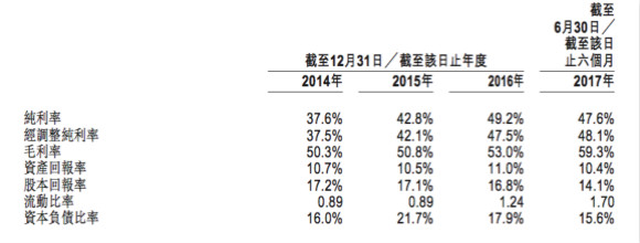 中教控股的盈利能力十分強勁,并且還在逐年提升。2014年至2016年,其毛利率分別為50.3%、50.8%及53%;純利率分別為37.6%、42.8%及49.2%。詳細情況如下: