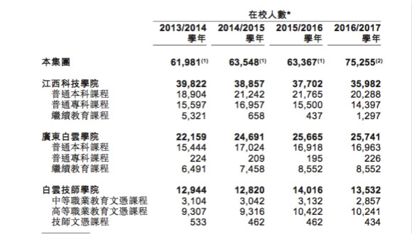 截止到2017年8月21日,中教新股在校人數為75255名, 其中江西科技學院的在校人數為35982名,廣東白云學院的在校人數為25741 名學生,白云技師學院的在校人數為13532名學生。
