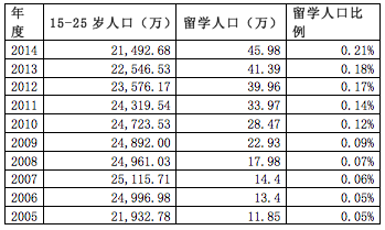 從表4 可以看出,在2007年,我國(guó)的留學(xué)潛在人口(15-25歲),達(dá)到峰值25,115.71萬(wàn)人,隨后到2014年人口減少了3,600多萬(wàn)至21,492.68萬(wàn)人。而從2007年至2014出國(guó)人口在潛在人口中占比從0.06%增長(zhǎng)了超過(guò)3倍達(dá)到了0.21%,平均1000人里就有2個(gè)人出國(guó)留學(xué)。