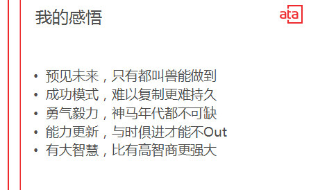 你可以選老婆,但是你不能選岳母,你可以選擇要不要加入一家公司,但是你不能選誰是你老板。而且這又是“他證”,別人認可才能證明你成功,所以這種情況下改變能力非常重要。改變能力背后最重要的就是學習能力。離開學校兩年,之前的東西基本歸零,以后在社會大學、在這個環(huán)境中怎么持續(xù)發(fā)展,這很重要。