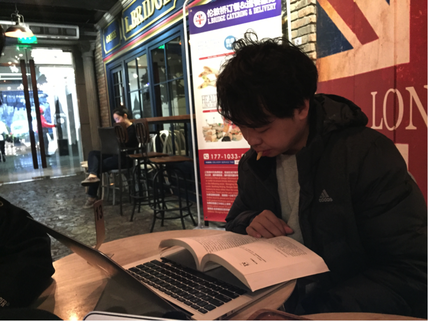 6點30,書籍銷售的相關工作告一段落,他去樓下咖啡廳寫微博。調試了半天,沒有網(wǎng),于是他買了一份薯條,邊吃邊看高曉松的《魚羊野史》。中間朋友找他聊天,他抬頭慢慢說“等我看完這段?!被蛟S這是一天中,唯一一段只屬于他自己的時間。