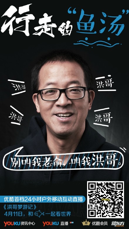 這檔命名為“洪哥夢(mèng)游記”的網(wǎng)絡(luò)直播從今日早上7點(diǎn)開(kāi)始。在接下來(lái)的10天內(nèi),優(yōu)酷網(wǎng)將記錄下,俞敏洪帶領(lǐng)的新東方名師艾力、周思成、90后小鮮肉于湉等人10天的行程,并在優(yōu)酷網(wǎng)以10天×24小時(shí)形式直播。