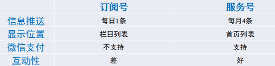 二是30與4的取舍。訂閱號(hào)每天能發(fā)一條消息,一個(gè)月能發(fā)30條消息,而服務(wù)號(hào)每個(gè)月只能發(fā)四條;