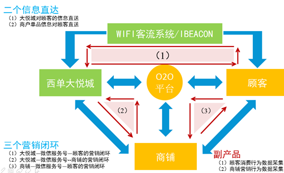 三個(gè)營(yíng)銷(xiāo)閉環(huán):(1)大悅城—微信服務(wù)號(hào)—顧客的營(yíng)銷(xiāo)閉環(huán),是通過(guò)一鍵WiFi達(dá)成的。WiFi入口是O2O最重要的一環(huán),如果沒(méi)有WiFi入口,就不能順利實(shí)現(xiàn)線下至線下的通路,包括品牌導(dǎo)航、牌號(hào)點(diǎn)餐、智慧停車(chē)等服務(wù)。
