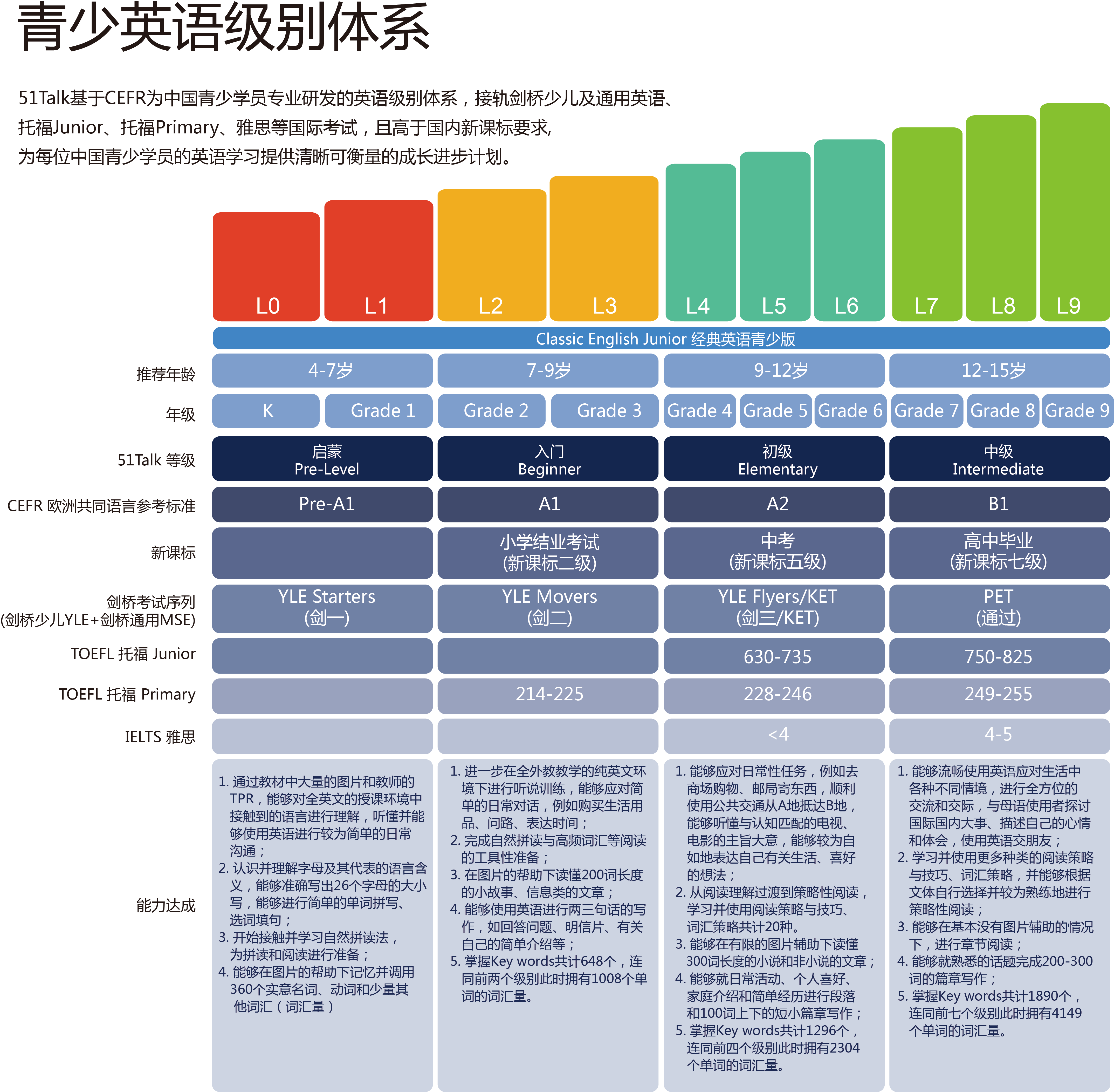級別體系。51Talk有個16級的英語級別體系,第16級接近于母語人士的水平。青少的級別體系最高到Level 9,相當(dāng)于優(yōu)秀初中畢業(yè)生的水平。