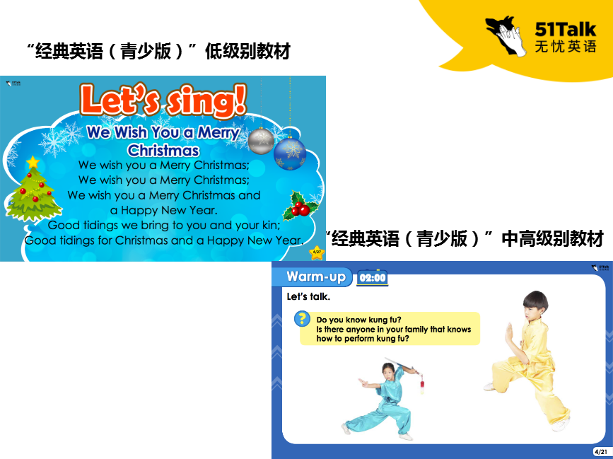 教材設(shè)計。51Talk在教材設(shè)計上關(guān)注到很多小細(xì)節(jié)的變化,非常專業(yè)。我們教材是完全獨立的知識產(chǎn)權(quán),有一個200多人的學(xué)術(shù)研發(fā)團隊。