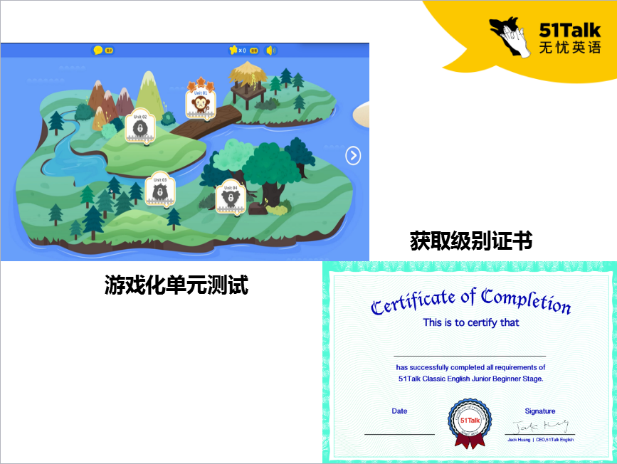 51Talk的付費課之后還有單元測試、級別測試并頒發(fā)證書。這個證書相對來說比較權(quán)威,我們跟第三方機構(gòu)合作,讓第三方機構(gòu)出題,最后給孩子出一個成績評定結(jié)果。