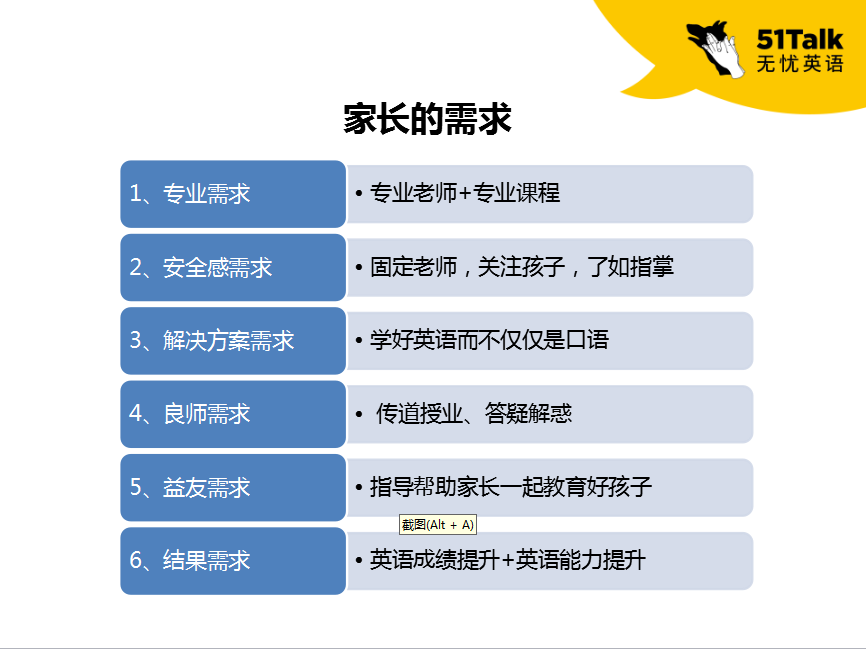 家長需求。51Talk非常重視家長,老師在面對學(xué)生的時候,間接會面對家長,或者說不得不面對家長。有這種經(jīng)歷,老師給孩子上課的時候,有時候家長會突然出現(xiàn),如果家長會英文就會直接跟老師講,如果不會英文他會選擇漢語,在百度里翻譯一下發(fā)給你。我們對滿足家長需求有一些自己的總結(jié)。