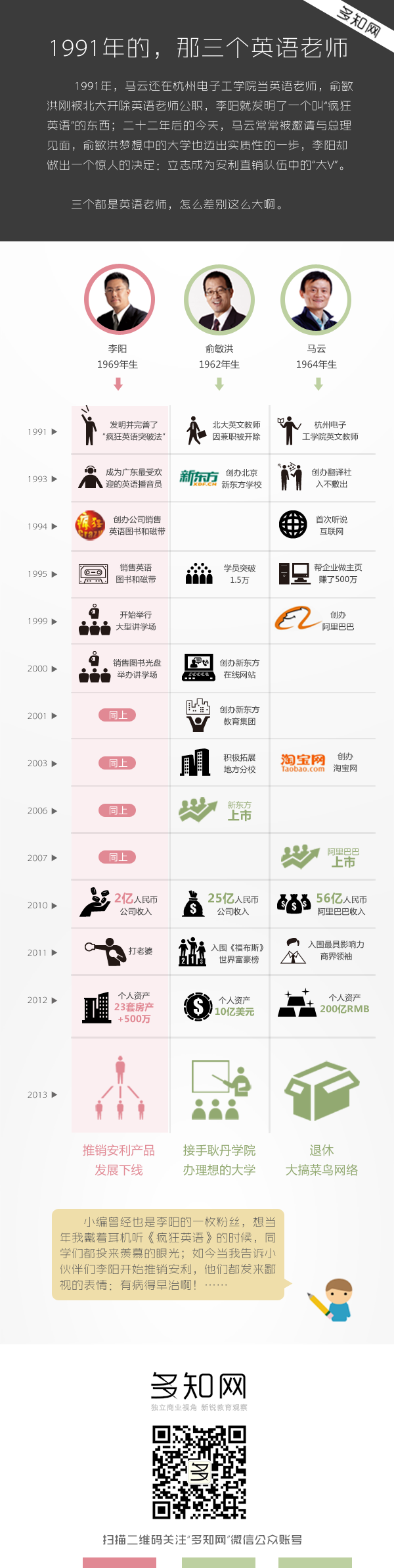 1991年,馬云還在杭州電子工學(xué)院當(dāng)英語(yǔ)老師,俞敏洪剛剛被北大開(kāi)除英語(yǔ)老師的公職,李陽(yáng)就發(fā)明了一個(gè)叫“瘋狂英語(yǔ)”的東西;二十二年后的今天,馬云常常被邀請(qǐng)與總理見(jiàn)面,俞敏洪夢(mèng)想中的大學(xué)也邁出實(shí)質(zhì)性的一步,李陽(yáng)卻做出一個(gè)驚人的決定:立志成為安利直銷隊(duì)伍中的“大V”。
