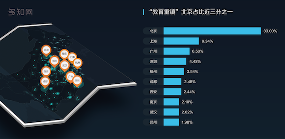 尤其北京,作為“培訓產(chǎn)業(yè)必爭之地”,比例高達33%,遠遠超過上海、廣州,甚至超過其他所有省會城市之和(26.43%)。