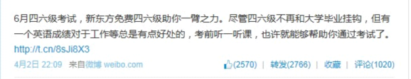 圖例1 俞敏洪老師的微博,足以證明大V的力量