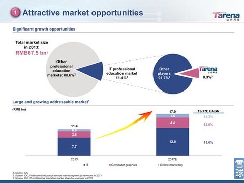 除了IT培訓(xùn),目前達(dá)內(nèi)還涉及的計(jì)算機(jī)圖形、網(wǎng)絡(luò)營(yíng)銷,IDC的數(shù)據(jù)顯示2013年分別是28億人民幣和9億人民幣的市場(chǎng)規(guī)模,IDC預(yù)計(jì)到2017年,IT培訓(xùn)、計(jì)算機(jī)圖形培訓(xùn)、網(wǎng)絡(luò)營(yíng)銷培訓(xùn)的市場(chǎng)規(guī)模分別是120億、44億、15億人民幣;