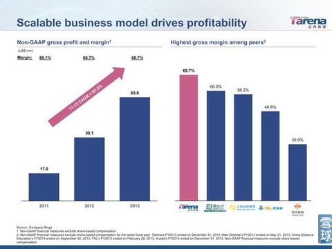 毛利率逐年提升,2013年的毛利率高達(dá)68.7%,高于目前中國(guó)所有在美上市的教育培訓(xùn)公司(新東方60%、正保58.2%、好未來48.8%、學(xué)大30.9%)