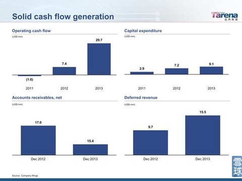 運(yùn)營(yíng)現(xiàn)金流從2011年的-100萬美元大幅提升至2013年的2970萬美元,資本開支2013年910萬美元,應(yīng)收賬款由2012年的1700萬美元降低至2013年的1540萬美元,遞延收入由2012年的970萬美元大幅提升至1550萬美元。
