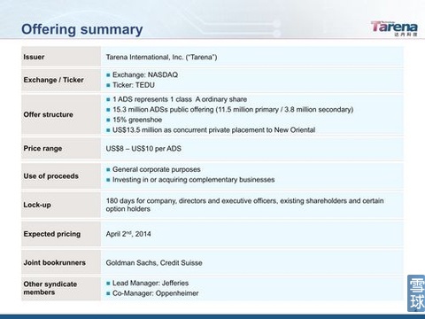 $達(dá)內(nèi)科技(TEDU)$ 宣布IPO發(fā)行價(jià)區(qū)間為8-10美元,計(jì)劃發(fā)行1530萬份ADS,公司發(fā)行1150萬股,獻(xiàn)售股東出售380萬股,按區(qū)間上端算,將融資1.15億,估值約5億美元。預(yù)計(jì)達(dá)內(nèi)教育將于4月2日公布最終IPO發(fā)行價(jià),之后正式IPO,應(yīng)該是2014年中概赴美IPO第一股,同時(shí)也將成為中國(guó)職業(yè)培訓(xùn)行業(yè)的第一家上市公司。