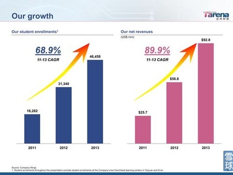學(xué)員數(shù)從2011年的16282增長(zhǎng)至2013年的46458萬,復(fù)合增長(zhǎng)率68.9%;