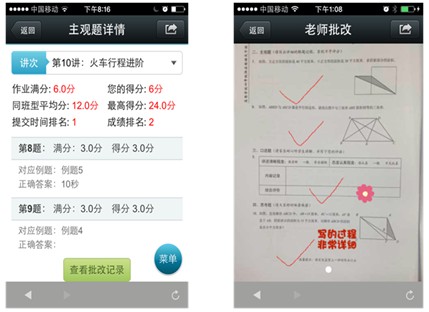 具體操作步驟,先將作業(yè)拍照上傳微信,隨后學生會收到高思批改完的短信提示,在學員系統(tǒng)里收到老師的批改(如圖1),給出評語。