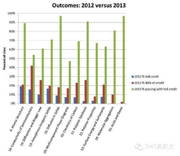 通過這種方式,edX的教育效果非常明顯。圖10中藍(lán)色是傳統(tǒng)學(xué)習(xí)方式中這些學(xué)生能夠得100分學(xué)員的比例,綠色是用這種新的教學(xué)方式能夠得滿分的學(xué)生的比例。在過去的傳統(tǒng)教學(xué)方式下,原子結(jié)構(gòu)課程只有不到20%的學(xué)生在舊的教學(xué)模式下得了100分,2013年用新的教學(xué)方式有90%的學(xué)生得了100分,可謂效果顯著。