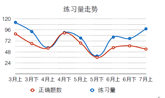 第二,有效地學(xué)生的學(xué)習(xí)情況進行統(tǒng)計和分析,了解學(xué)生知識點和能力兩個模塊各個維度的血情況。比如,我們通過對學(xué)生聯(lián)系量和題目正確率進行分析,就可以看出學(xué)生階段性的學(xué)習(xí)情況。如圖所示,在4月下,聯(lián)系量和正確題目數(shù)量都在迅速上升,說明這個階段學(xué)生比較用功,訓(xùn)練相對有效。而在7月上,雖然練習(xí)量有所增加,但是正確題目數(shù)卻出現(xiàn)了下降趨勢,說明訓(xùn)練是有問題的,沒有針對學(xué)員的問題進行有效的練習(xí),就需要老師對題目、訓(xùn)練重點等進行適度的分析和調(diào)整。