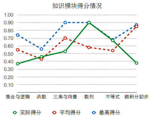 同樣,我們可以換一個維度對學(xué)生的問題進行分析。如下圖,是對學(xué)生知識模塊掌握狀況的統(tǒng)計。通過這個數(shù)據(jù),我們能夠看到,在“微積分初步”這個知識點上,這個學(xué)生的掌握水平是低于正常水平的,需要在這個知識點上進行訓(xùn)練和學(xué)習(xí)。