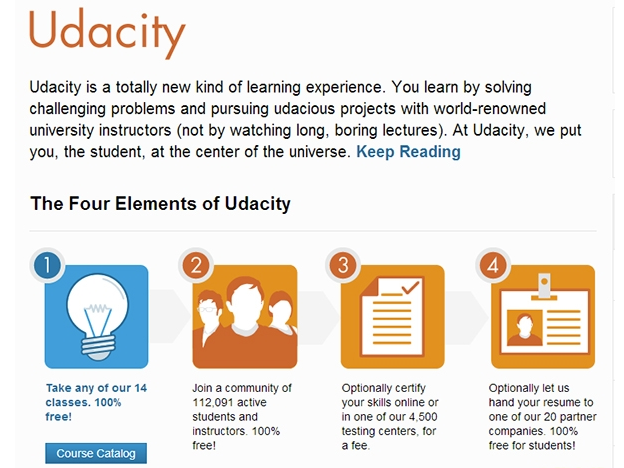 Udacity的課程在一開始是免費的,學生可選擇參加一些收費的認證考試。同時,Udacity通過幫助畢業(yè)生找工作賺取介紹費。但是,Udacity在2013年經(jīng)歷了一次轉型,宣稱免費課堂的模式將不再運營,并從此以后該平臺將出售專業(yè)的在線培訓。目前Udacity已把重心放到了科技行業(yè)的職前培訓上,為科技行業(yè)的畢業(yè)生提供在線教學課程。