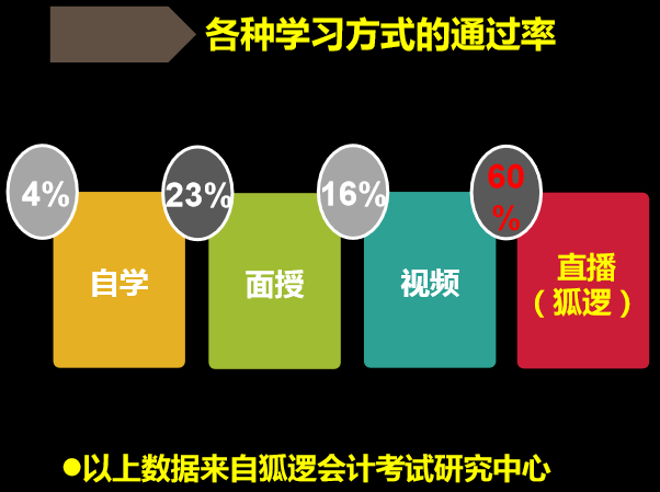 狐邏會計考試研究中心披露了一份數(shù)據(jù):自學通過率4%,面授通過率23%,視頻通過率16%,直播通過率是60%??荚囃ㄟ^率與七大因素相關:堅持不懈、隨時答疑、解題模版、互動上課、自主驅動、考點切片、智能題庫。