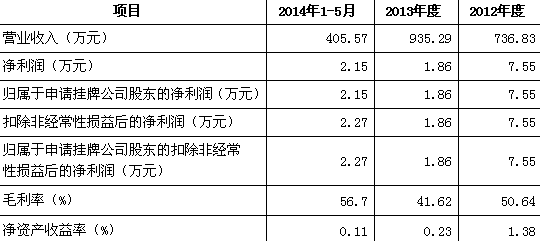 在2014年1-5月、2013年和2012年,其主營(yíng)業(yè)務(wù)收入分別為405.57萬(wàn)元、935.29萬(wàn)元和736.83萬(wàn)元;毛利分別為229.95萬(wàn)元、389.27萬(wàn)元和373.15萬(wàn)元;凈利潤(rùn)分別為2.15萬(wàn)元、1.86萬(wàn)元和7.55萬(wàn)元。