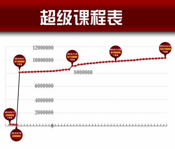余佳文對鋪天蓋地的的負(fù)面和質(zhì)疑毫不擔(dān)心,反而感到很“欣慰”,因?yàn)槌壵n程表一度排名蘋果應(yīng)用商店免費(fèi)應(yīng)用總榜第四名,教育類別第一名。根據(jù)鈦媒體對91和360應(yīng)用商店的下載量監(jiān)測,每次余佳文發(fā)表言論后都會帶動超級課程表的下載量猛增,而在此之前,幾乎鮮有增長,見下圖:
