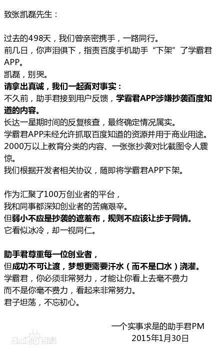 多知網(wǎng)2月4日消息,針對(duì)百度旗下應(yīng)用渠道下架學(xué)霸君一事,今日,百度手機(jī)助手作出回應(yīng),稱百度助手接到用戶反饋,學(xué)霸君APP涉嫌抄襲百度知道的內(nèi)容,經(jīng)過一星期反復(fù)核查,最終確認(rèn)情況屬實(shí)。
