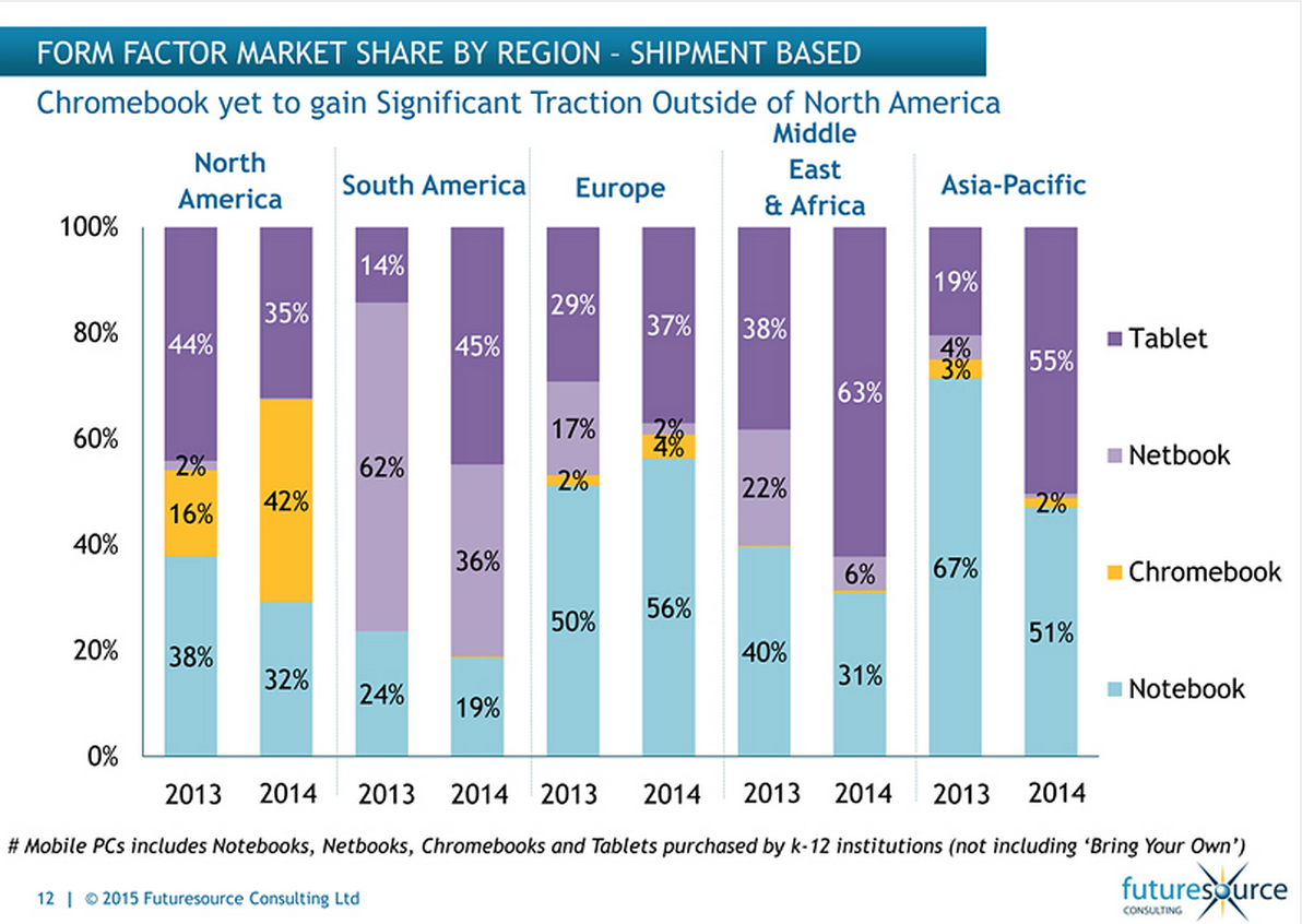 Google在教育市場上的努力,讓Chromebook在全球市場的份額不斷擴大。根據(jù)FUTURESOURCE CONSULTING的報告顯示,Chromebooks已經(jīng)在北美的K-12市場占領(lǐng)了42%的份額,而這個數(shù)字在2013年,只有16%。而即使在其他國家和地區(qū),Chromebook的市場份額也是十分不錯的。