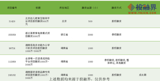 在投資界平臺上與資金方交互次數(shù)最多的在線教育項目中,排名前五的分別為北京幼兒教育互聯(lián)網(wǎng)平臺項目、浙江某教育電商模式項目、湖南岳陽多功能辦公學(xué)習(xí)軟件項目、漢語速成網(wǎng)絡(luò)平臺項目和湖南國學(xué)連鎖品牌專利項目。