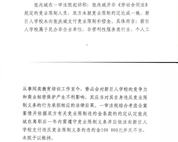 2015年3月19日,法院公布了巨人集體出走案終審民事判決書。張兆斌、趙昱、劉劍、宋涵希、丁凱、李萌、李泉、趙國(guó)智、饒海波、侯瑩違反《知識(shí)產(chǎn)權(quán)保護(hù)和競(jìng)業(yè)禁止協(xié)議》,他們須繼續(xù)履行合同規(guī)定的競(jìng)業(yè)限制,直到期滿,累計(jì)向巨人學(xué)校賠付金額不低于100萬(wàn)元人民幣的賠償款。
