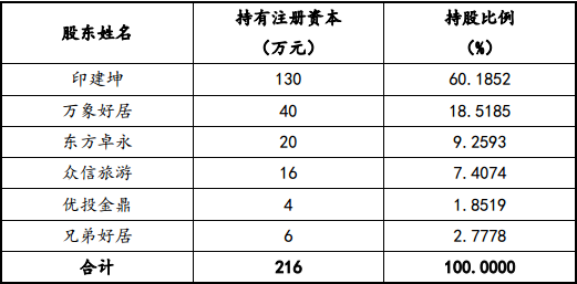實施第一步增資后,異鄉(xiāng)好居注冊資本將由人民幣200萬元增為人民幣216萬元,增資部分由眾信旅游和兄弟好居認(rèn)購,增資完成后異鄉(xiāng)好居股權(quán)結(jié)構(gòu)如下表所示: