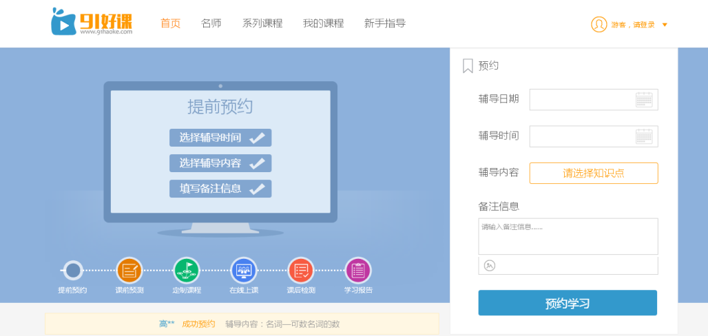 學(xué)生在91好課下單前,有一個(gè)課前預(yù)測(cè)環(huán)節(jié)。預(yù)測(cè)題目就是5道與學(xué)生疑問相關(guān)的題目,做完之后下單。所有老師通過搶單的方式獲取訂單。獲得訂單的老師會(huì)打電話給學(xué)生仔細(xì)了解學(xué)生的弱項(xiàng),再根據(jù)學(xué)生弱項(xiàng)去備課。最后老師通過直播的方式上課。目前91好課也上線了系列課程。