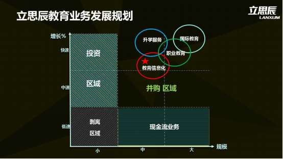 上圖展現(xiàn)的則是立思辰具體業(yè)務(wù)發(fā)展規(guī)劃。立思辰方面表示,投資的對象是規(guī)模小但增長速度快的業(yè)務(wù),并購則是增速一般、規(guī)模中等的業(yè)務(wù),最后形成規(guī)模大、增速快的業(yè)務(wù)板塊。