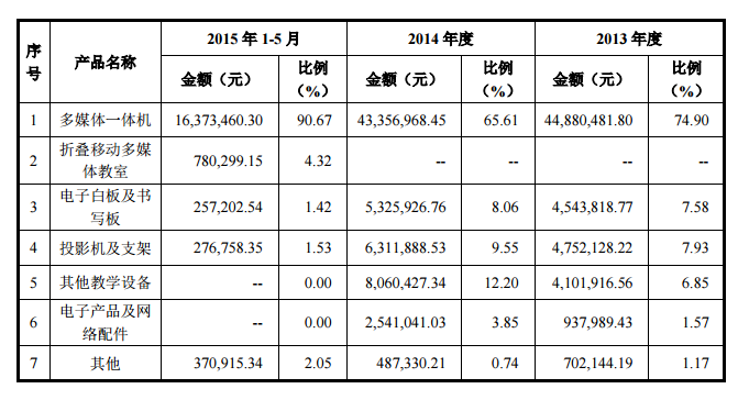 公告顯示,2015年1-5月、2014年及2013年主營業(yè)務(wù)收入分別1805萬元、6608萬元及5992萬元。具體營業(yè)收入結(jié)構(gòu)如下表所示: