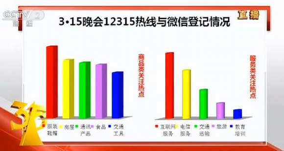 央視315晚會披露12315熱線和微信登記的情況,其中,教育培訓(xùn)在服務(wù)類關(guān)注熱點(diǎn)中排名第五。