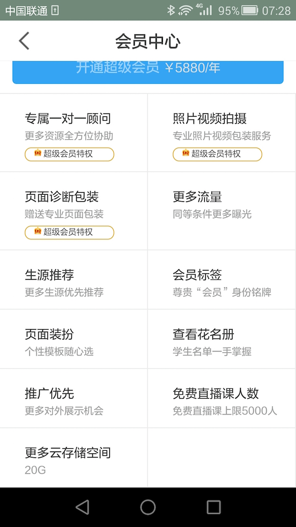 高級會員另外加入了照片視頻拍攝、頁面診斷包裝等服務(wù),直播課和儲存空間的上限也更大。超級會員則加入了一對一顧問服務(wù)。