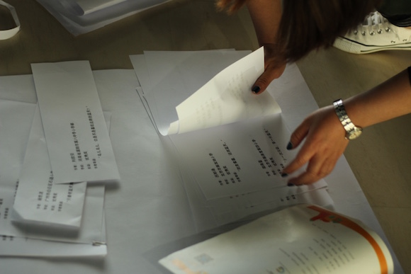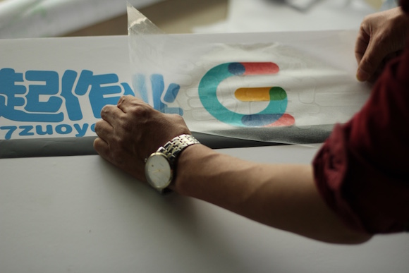 在做玻璃墻展示的同時,另一邊展板的后期工作也在緊鑼密鼓地進行,上午展板的第一層已經(jīng)粘好,還需要貼寫真(展板外部白色貼紙),這是個熟能生巧的活,兩個工作人員配合,“撕、貼、刮、剪”一氣呵成,幾分鐘后,一個白色的背板就做好了。